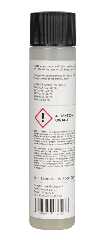 Adeziv ce se aplica pe suprafata / patul de printare a imprimantei 3D pentru o aderenta buna a filamentului. Se agita usor si se aplica inaintea inceperii procesului de printare. Se poate folosi pe sticla sau aluminiu, formeaza un strat lipicios, f. putin vizibil la uscare si se poate curata cu apa sau alcool. Piesa se dezlipeste dupa racirea suprafetei.